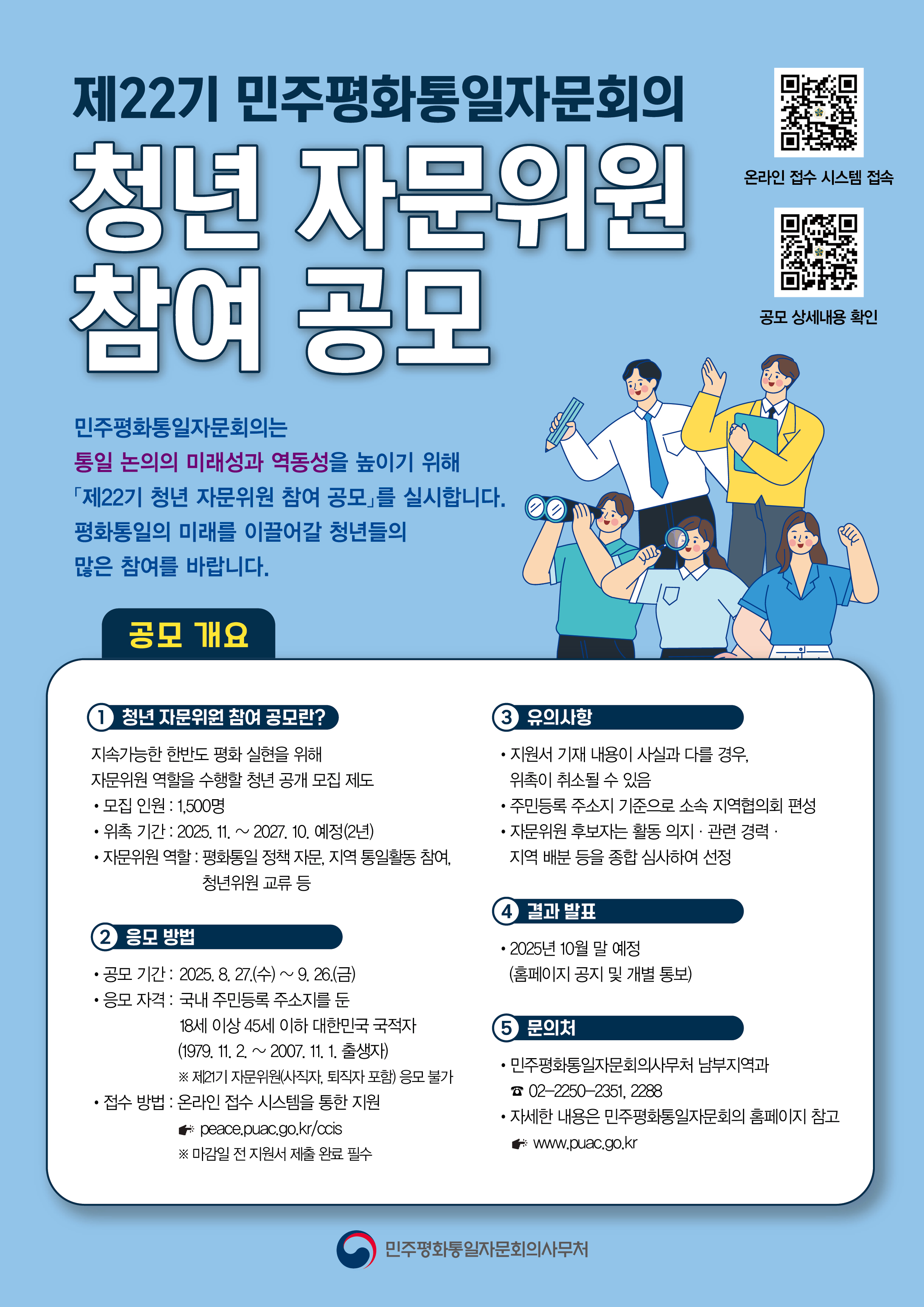 대통령직속 민주평화통일자문회의는 통일 논의의 미래성과 역동성을 높이기 위해 「제22기 청년 자문위원 참여 공모」를 실시합니다. 평화통일의 미래를 이끌어 갈 청년들의 많은 참여를 바랍니다.